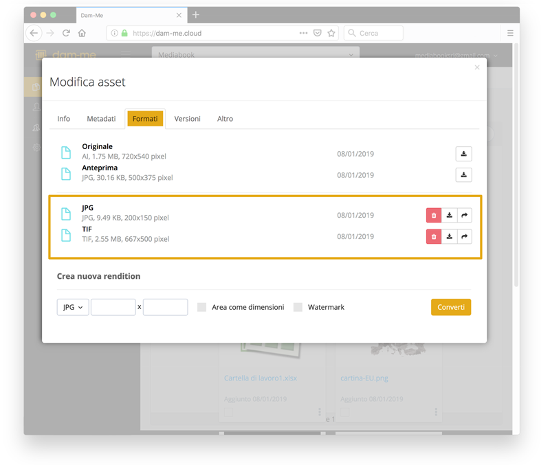 Scarica gli asset digitali in locale per un uso veloce e grazie a codici incorporati sono sempre aggiornati a DAM-ME.