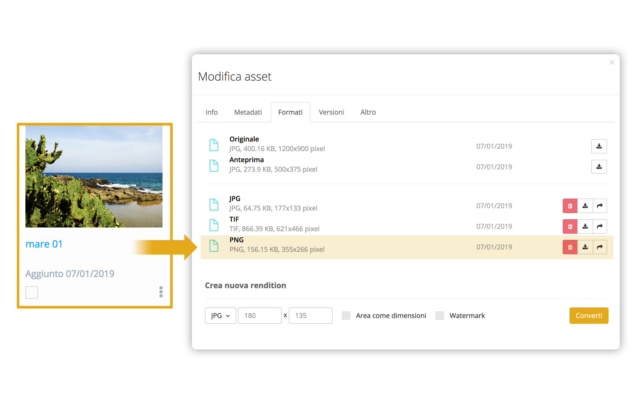 Non serve Photoshop! Con DAM-ME chiunque può convertire e distribuire facilmente un file a seconda della tipologia di richiesta, ad esempio file PSD ed AI per l’utilizzo nei documenti InDesign; JPEG e PDF per le necessità commerciali.